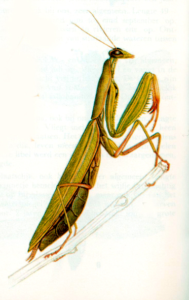 Op onze avondwandeling zoeken we nog altijd naar een eigenaardig diertje. Men zegt er ‘Mante religieuse’ tegen. Een soort sprinkhaan, al kruipt het dier. ’t Is niet zo dik als een strohalm met poten voor en achter. Zo dun als een stopnaald en zeker zo lang. De boeren zullen het voor ons zeker niet zoeken, want ze hechten er een bijgeloof aan. Ocharme!"
